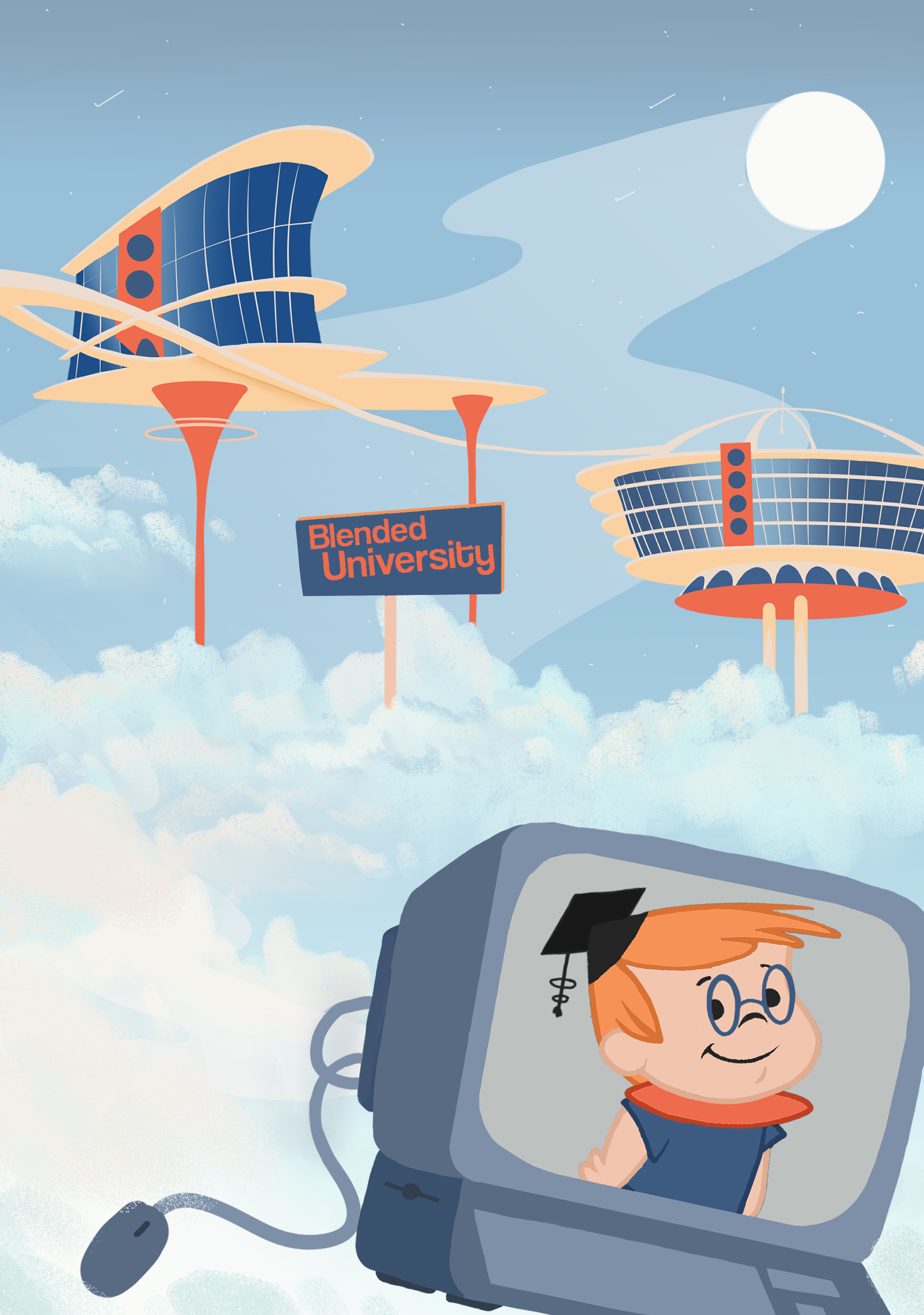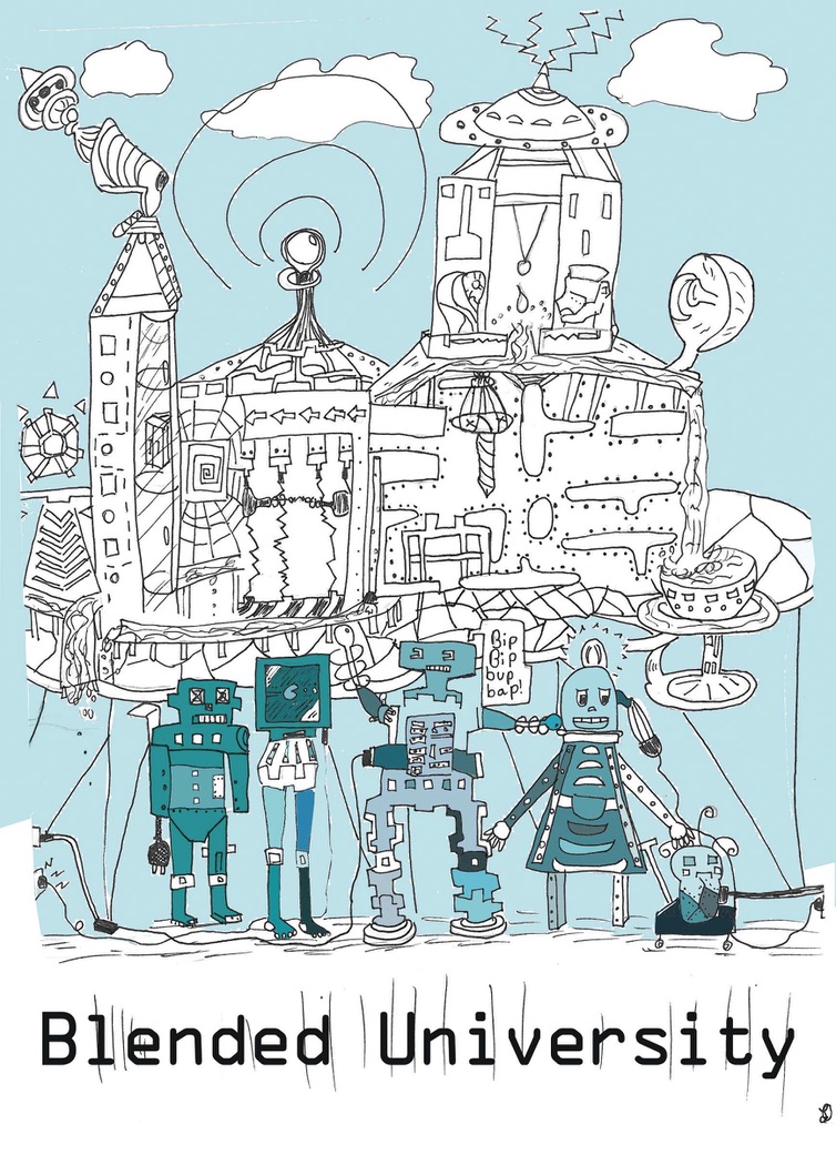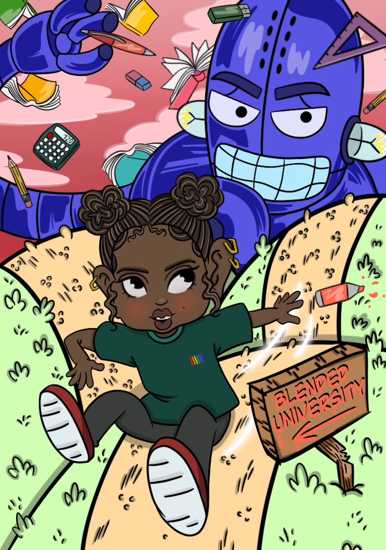 Katarina Mamurin, an der Macromedia (FFM) für Design (Illustration) im ersten Semester: „‚Blenden University‘ – die Verbindung von Präsenz- und Onlinelehre zu verbinden. Nach der Definition habe ich mir einige Gedanken zum vielseitigen Zukunftsthema gemacht und habe mich letztendlich für diese finale Illustration entschieden. Ich möchte mit meiner Illustration die Tatsache darstellen, dass die digitale Lernweise jeden Tag an Wichtigkeit gewinnt und einen großen Beitrag zum Lernen leistet. Für mich persönlich fühlt sich der digitale Lernumschwung sehr aufdringlich an, trotzdem akzeptiere ich diese Veränderung und kann der Tatsache nicht aus dem Weg gehen. Der Roboter soll die irgendwo schon künstliche Intelligenz unserer digitalen Geräte darstellen und die aufdringliche Atmosphäre der Digitalisierung. Ich persönlich benutze gerne noch Notizbücher, Hefte und Kugelschreiber, während viele meiner Kommilitonen iPads, iMacs oder ApplePens benutzen. Der Stift in der linken Hand des Roboters soll den Ausgleich von analogen und digitalen Lehrmaterialien und Präsenz- und Onlinelehre darstellen.“