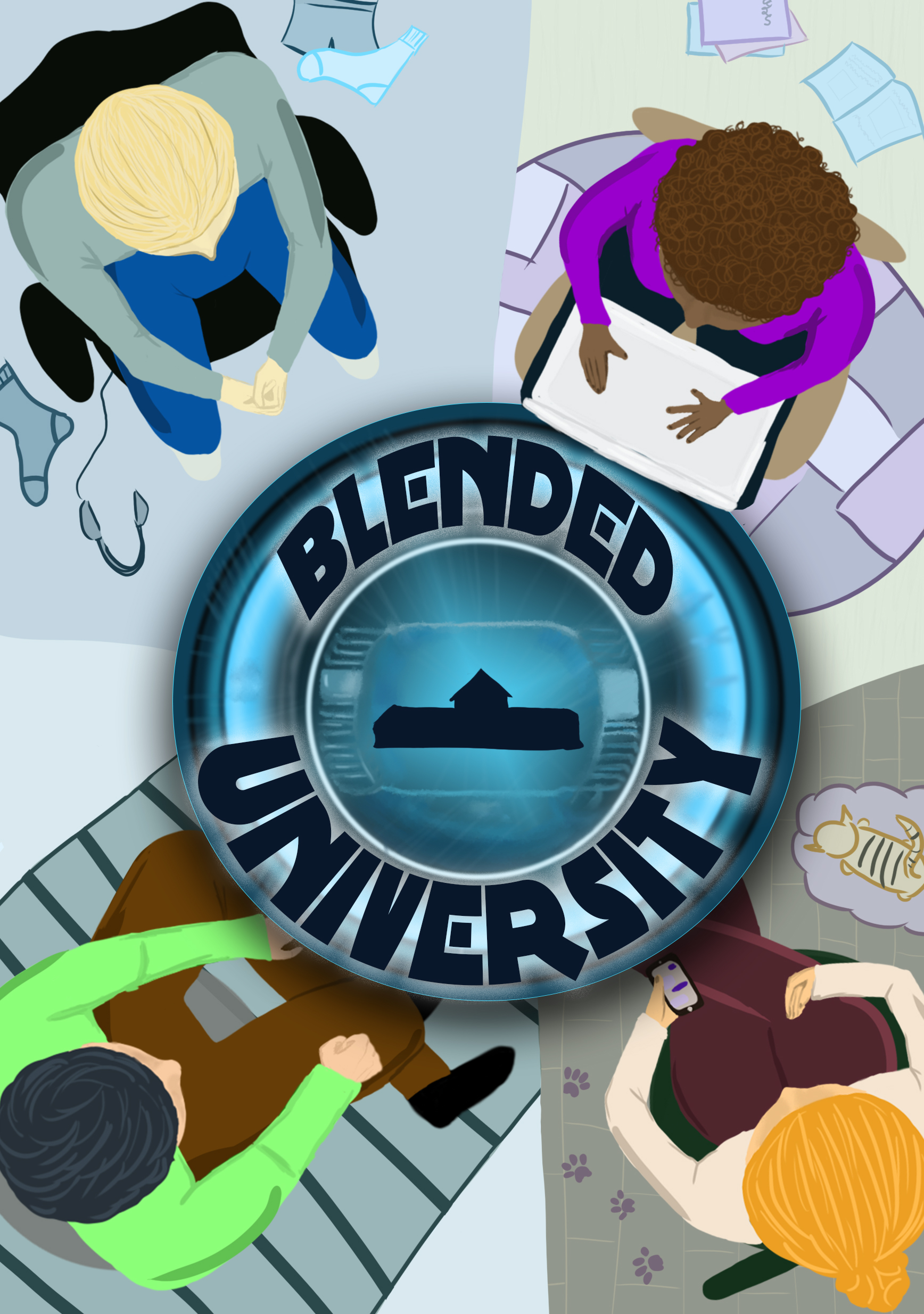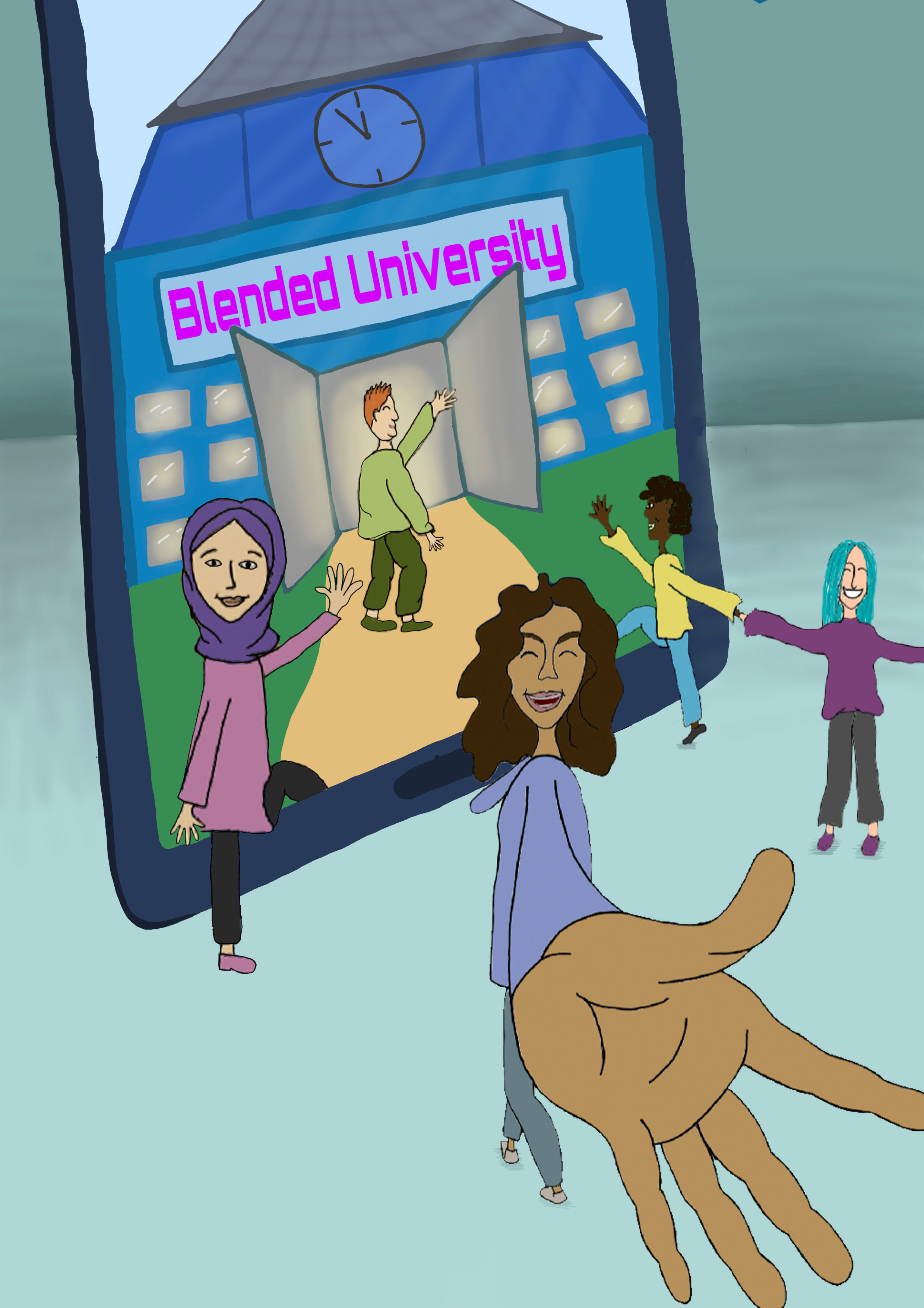 Alina Kling, studiert Design im ertsen Semester an der Hochschule Macromedia, University of Applied Sciences: „Die Illustration soll darstellen, dass Menschen immer miteinander kommunizieren und arbeiten können, egal wo sie sich befinden. Sei es in der Uni oder von zu Hause, denn im Endeffekt sitzen alle am selben Tisch und das macht die ‚Blended University‘ aus.“