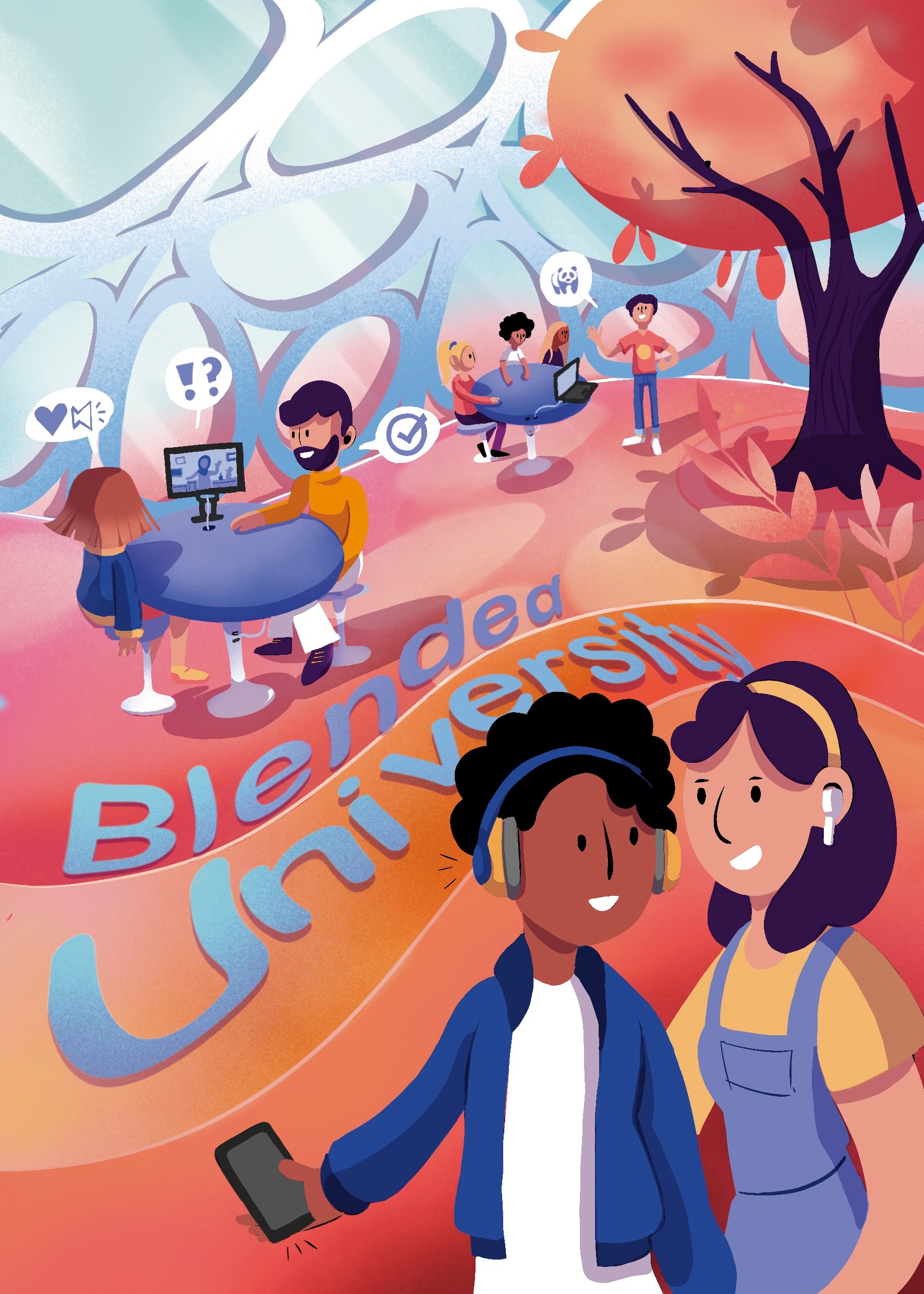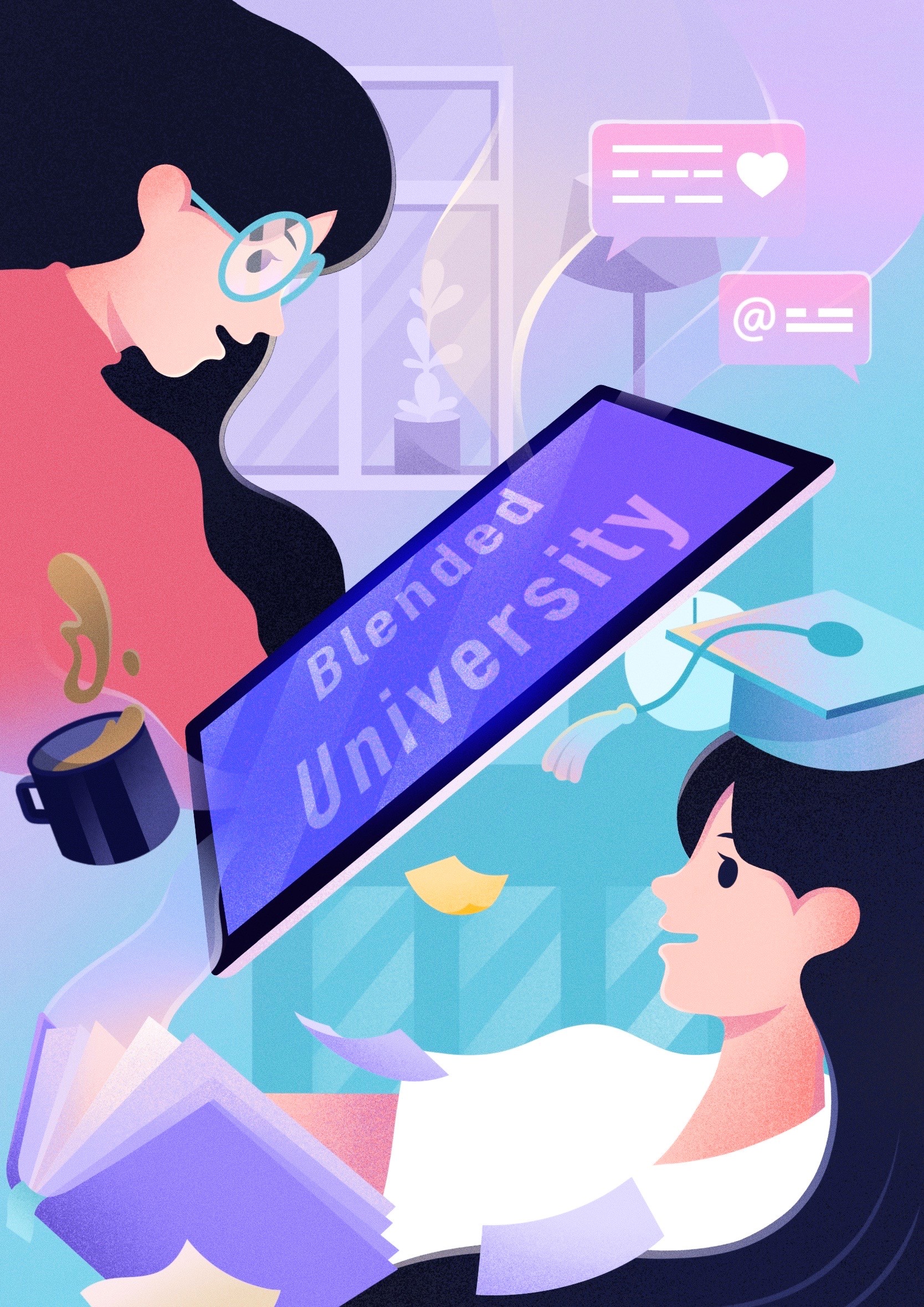 Lina Omari, Studentin an der Macromedia Hochschule: „Im Zeitalter der Digitalisierung und vor allem in Zeiten der Pandemie, mussten viele Menschen insbesondere Studenten auf die virtuelle Welt umswitchen. Das einzige Medium welches uns in dieser Zeit stark verbunden hat war lediglich ein Bildschirm, welcher uns zugleich das Gefühl von Einsamkeit und des Beisammensein geben konnte. In meiner Illustration, steht das Tablet stellvertretend für ein Fenster durch welches man in eine hoffentlich freudigere Zukunft blickt, aber symbolisiert auch das Medium, welches die „Blended University“ in meinen Augen primär veranschaulicht.“