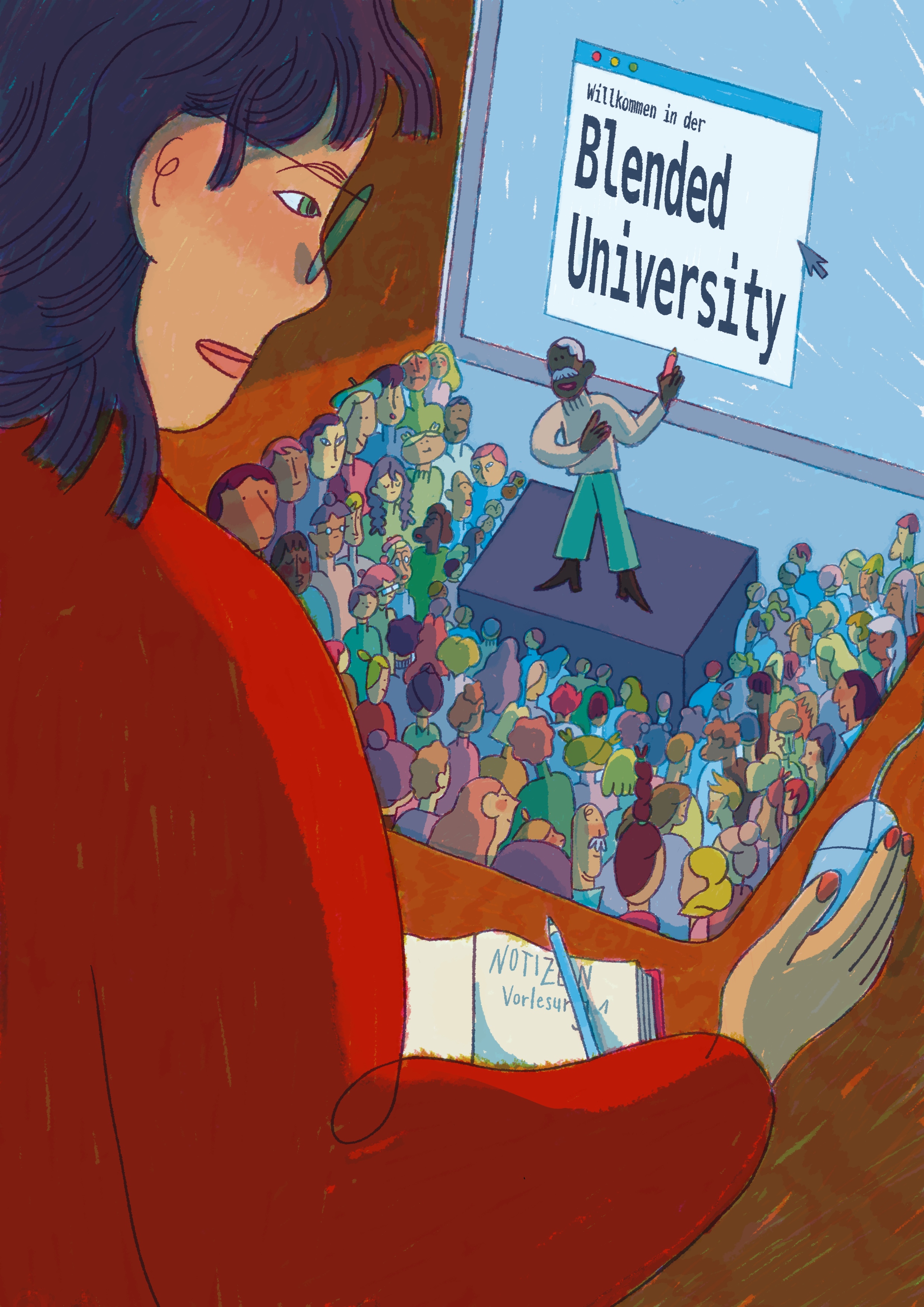 Hannah Krüger, studiert Kommunikationsdesign an der Burg Giebichenstein Kunsthochschule Halle im ersten Semester: „Bei meiner Illustration geht es darum, Online- und Vorortformate als gleichrangige Optionen darzustellen, die als Einheit zusammen fungieren. Der Betriff „Präsenzlehre“ ist meines Erachtens nicht zukunftsfähig, weil moderne Technologie es ermöglicht, digital zeitlich und virtuell räumlich präsent zu sein. Wenn die Corona-Pandemie den Universitäten für die Zukunft eines gelehrt haben sollte, dann ist es, Heterogenität in Lehr- und Lernsettings als Chance zu sehen, um Eigeninitiative und Flexibilität in der Bildung zu fördern.“