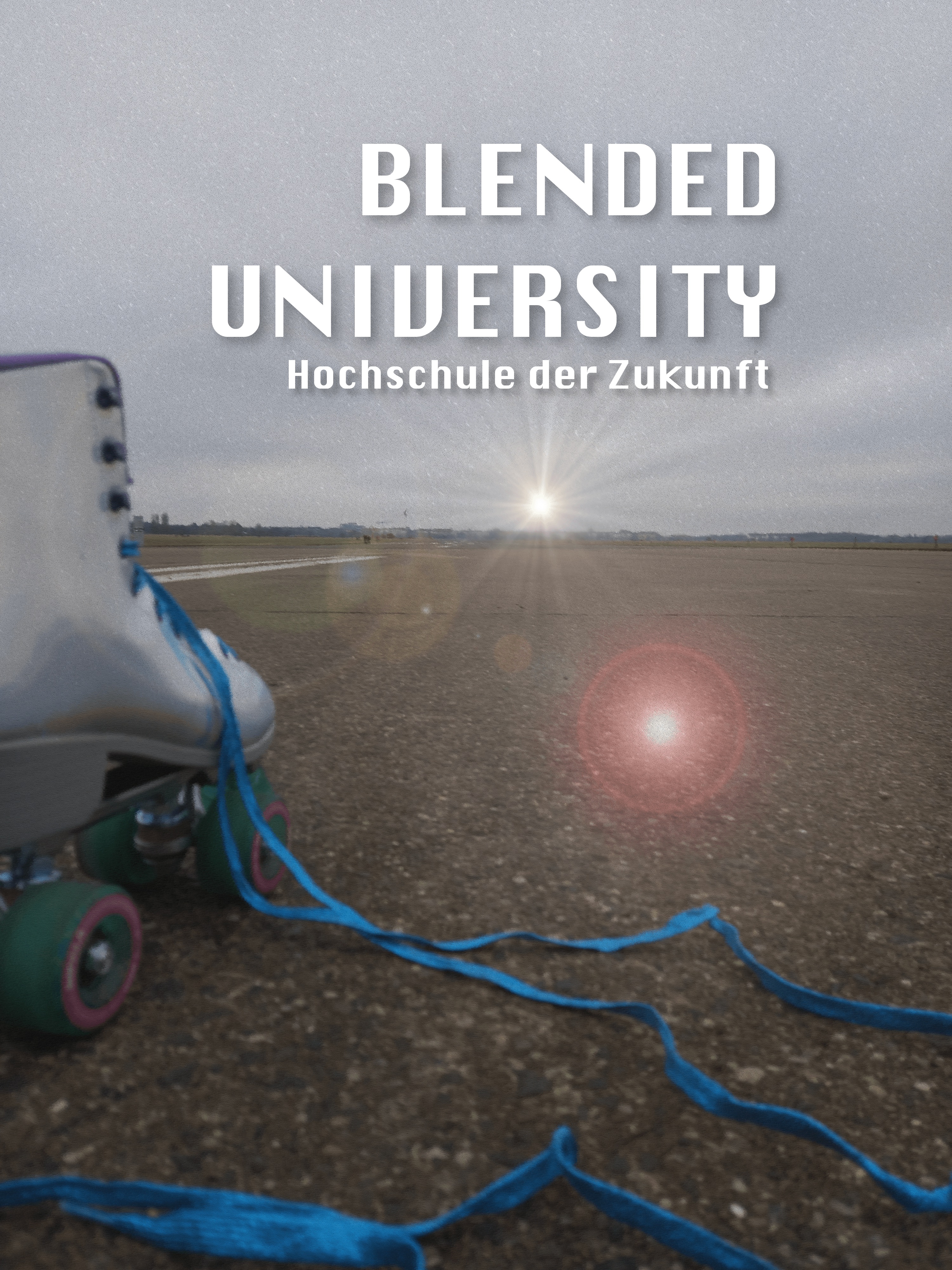 Nigjar Marduchaeva, Studentin der Medienwissenschaft an der TU Berlin (MA, 7. Fachsemester): „…unter Einbezug Ihrer zur Verfügung gestellten Wordcloud, haben mir den Anstoß für die Analogie von Rollschuhen vor einem großen Rollfeld gegeben. Der Raum für Studium und Lehre einer Blended University ist ein weites Feld und bietet diverse Bewegungsmöglichkeiten. Der Rollschuh ist eine Alternative zum alltäglich üblichen Schuhwerk, die u.a. die Geschwindigkeit der Fortbewegung beschleunigen kann. Ferner erfordert Rollschuhfahren, insbesondere bei Anfänger:innen, Mut und Übung zugleich. Eigeninitiative und Ausdauer sind auch in einer digitalisierten (Hochschul-)Welt trotz Optimierungen in der Technologie und somit oftmals Vereinfachung von Abläufen weiterhin wesentlich. Auch kann der Rollschuh als die spielerische und interaktive Komponente beim Blended Learning verstanden werden, sowie Fitness – mentale und/oder physische. Der noch nicht angezogene Schuh mit ungebundenen Schnürsenkeln lädt darüber hinaus zu Entscheidungsfreude und Tatendrang ein. Hepp schreibt in seinem Buch: „Wir leben nicht in der digitalen Gesellschaft. Wir sind aber auf dem Weg dahin.“ Dies kann als zutreffend auch im Hinblick auf die Zukunft der Hochschule(n) betrachtet werden. Damit die Hochschule der Zukunft wiederum ein spannender und sicherer Ort wird, lohnt es sich, digital ins Rollen zu kommen und dabei in Bewegung zu bleiben. Welches genau das individuelle Ziel ist, kann sich bei den Studierenden jeweils auf der „Fahrt“ dorthin präzisieren. Die Sicht ist, wie auf der Illustration, schon einmal hell und frei. Die gewählte Computerschrift („Silom“) transportiert durch klare Farbe und Abwechslung die Moderne. Es sind sowohl eckige als auch runde Elemente enthalten. Die Form ist insgesamt prägnant ohne dabei aufdringlich zu sein. Auch ohne Serifen wirkt sie stabil.“