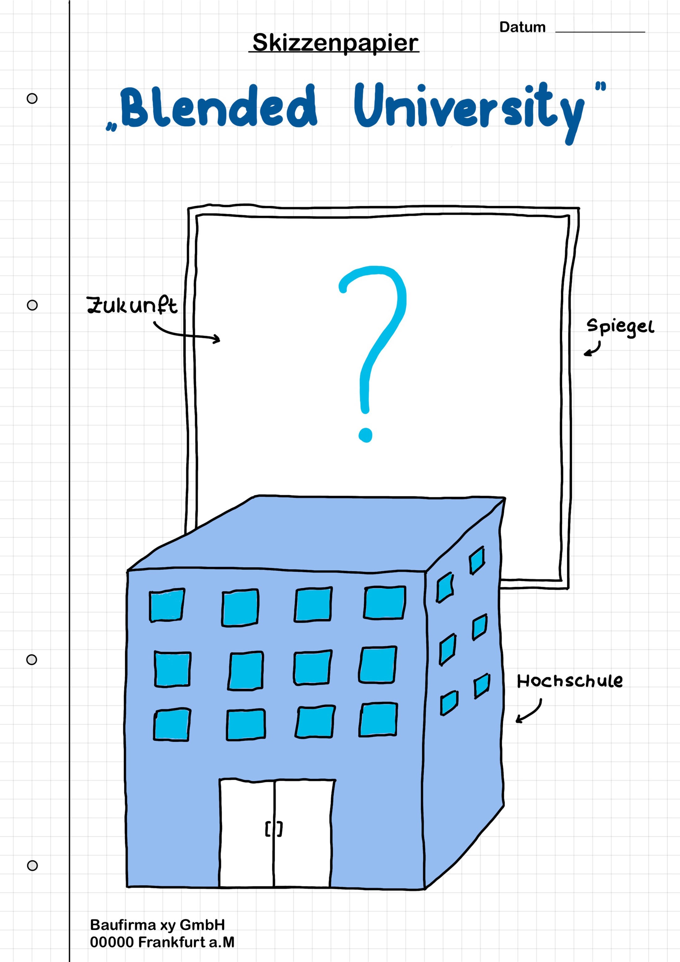 Shivon Hanfler studiert aktuell in Frankfurt am Main an der „Hochschule Macromedia, University of Applied Science“ im 1. Semester Mediendesign: „Meine Illustration zum Thema ‚Blendet University‘ zeigt die Skizze einer Universität/ Hochschule der Zukunft. Die Universitäten und Hochschulen von Morgen existieren heute noch nicht. Niemand weiß, was in 10 Jahren der Standard sein wird, weshalb das zukünftige ‚Normal‘ in der Gegenwart noch nicht auf Papier gebracht werden kann. Die Skizze verdeutlicht, dass das Thema ‚Blendet University‘ nur eine Idee ist, welche noch viele Prozesse und Entscheidungen durchlaufen muss bis sie zu einem finalen Projekt werden kann.“
