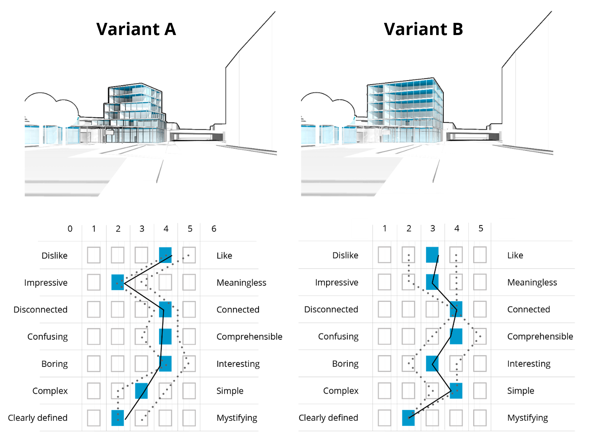 Ein anderes Beispiel ist die Untersuchung der Raumwirkung. Die Studierenden entwickeln dazu eine Studie, in der verschiedene Varianten zur Gestaltung eines Raums miteinander verglichen werden. Nehmen wir zum Beispiel eine Bahnhofshalle in Varianten mit unterschiedlicher Deckenhöhe. Die Studienteilnehmer können sich dann die verschiedenen Varianten ansehen und auf einer Skala von hell/dunkel, angenehm/unangenehm, schön/hässlich usw. bewerten.