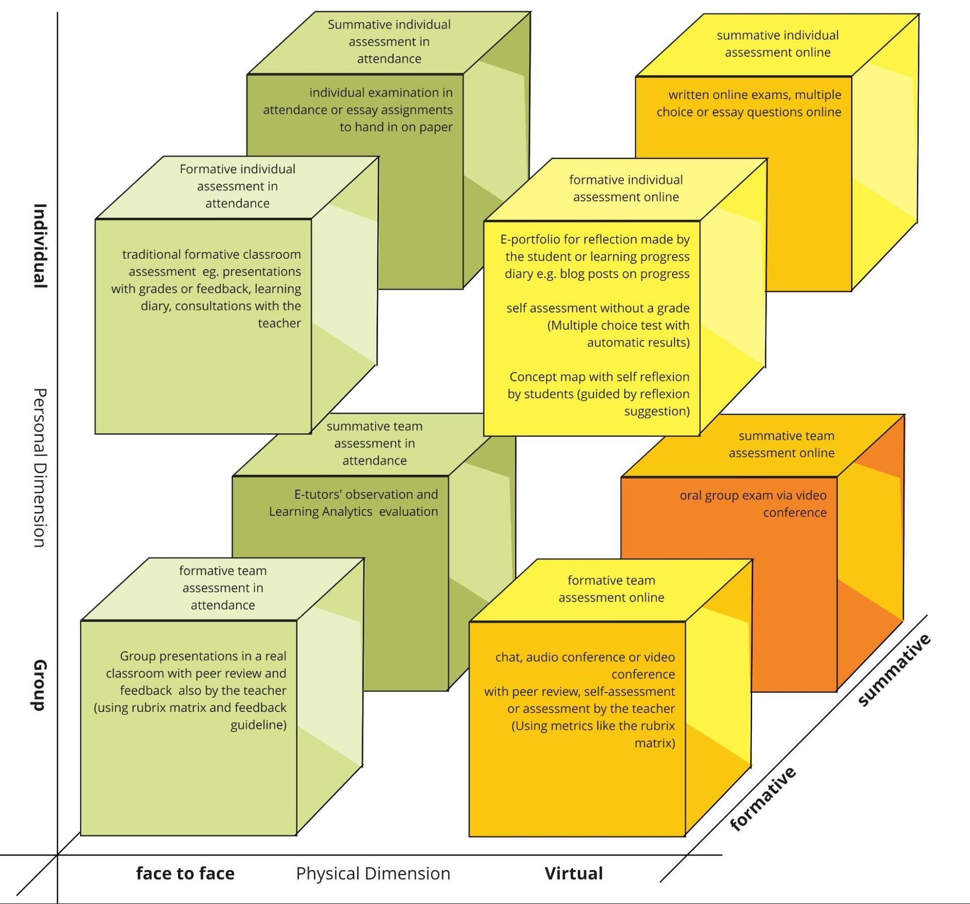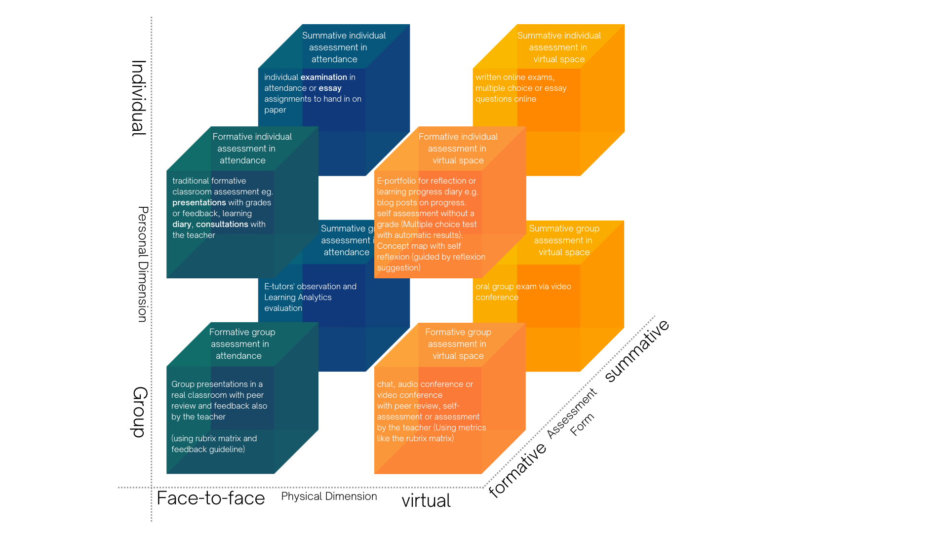 Anne Jantos: Als Orientierungshilfe bei der Auswahl und Kombination von verschiedenen Assessmentformen haben wir den Blended Assessment Cube entwickelt (Jantos/Langesee 2023). Er soll aufzeigen, welche Kombinationen möglich bzw. zielführend sind, und zugleich Inspiration und Information zu expliziten Methoden liefern. Wichtig bei der Auswahl sind natürlich weiterhin die Ziele und die Rahmenbedingungen der jeweiligen Lehrveranstaltung. Ausgehend vom Blended Learning Cube von Schoop et al. (2006) haben wir drei Dimensionen definiert: 1) die Art des Assessments (formativ oder summativ), 2) die persönliche Dimension (wird einzeln oder in Gruppen geprüft) sowie 3) die physikalische Dimension (wird vor Ort oder online/remote geprüft). Bei der Kombination ist schließlich darauf zu achten, dass Mischungen ausgewählt werden, die nicht zur Überlastung der Studierenden (und der Lehrenden) führen, und dass Kombinationen ausgewählt werden, die als fair wahrgenommen werden.