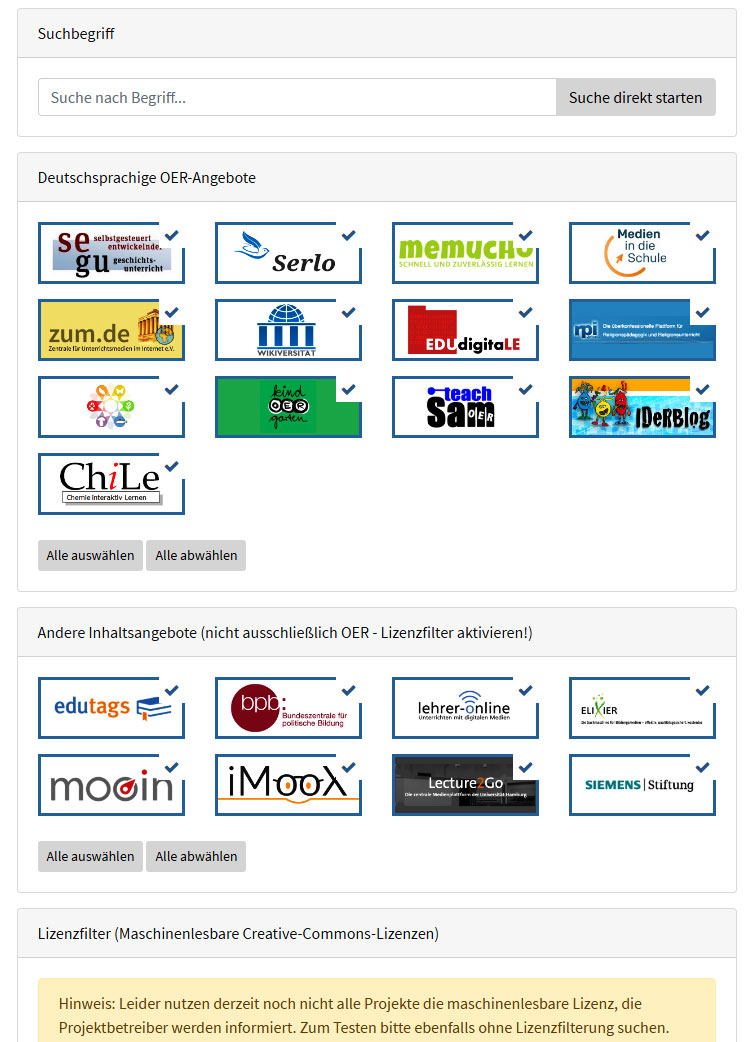 Leider habe ich festgestellt, dass noch nicht alle Inhaltsanbieter im deutschsprachigen Raum diese einsetzen. Das ist doppelt schade: Zum einen weil in vielen OER-Workshops auf search.creativecommons.org hingewiesen wird – viele OER-Webseiten blieben also bisher Suchenden potenziell verbogen.