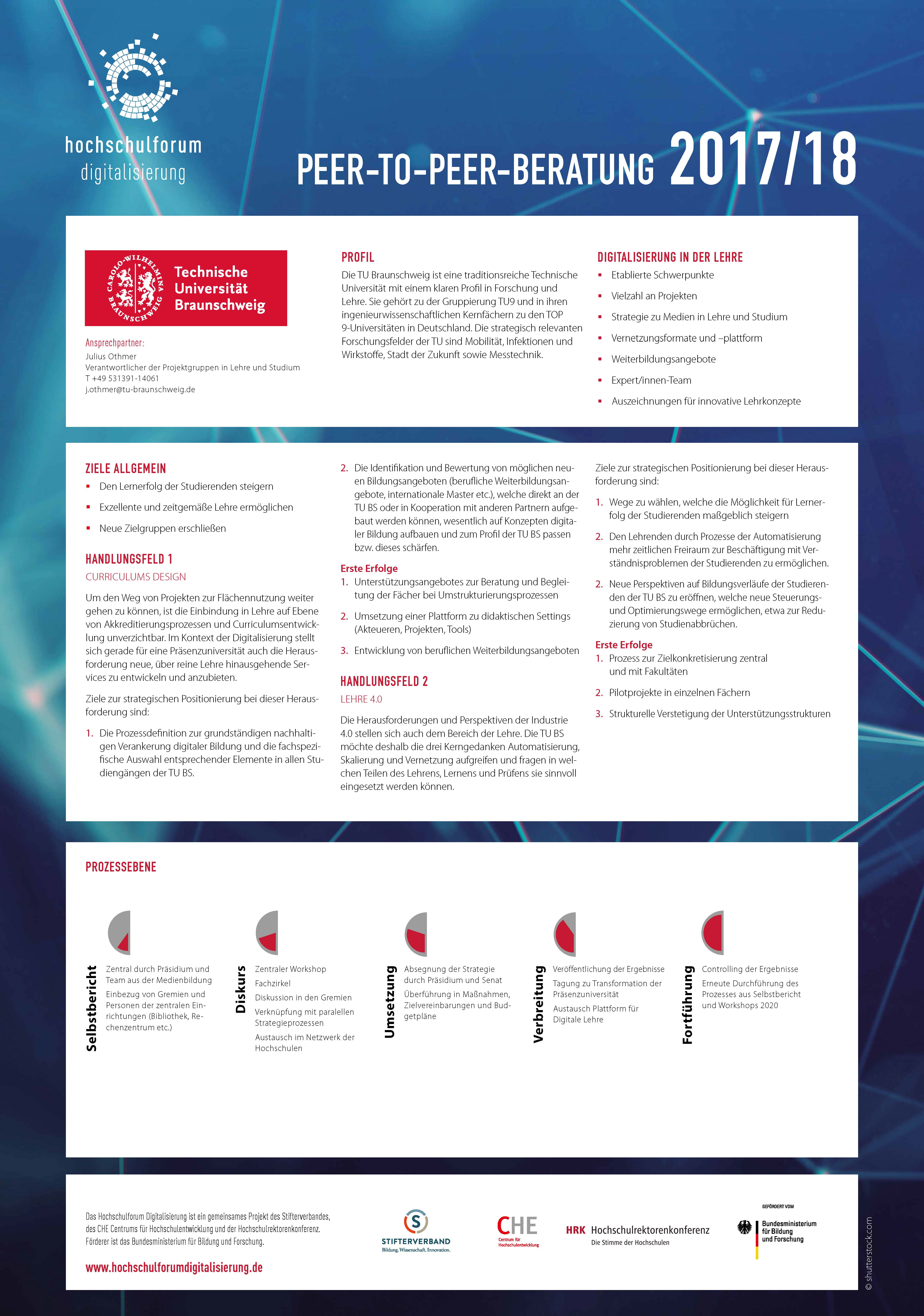Die TU Braunschweig hat 2017/18 an der Pilotphase der Peer-to-Peer-Beratung teilgenommen. Bei der Strategiekonferenz stellte die Hochschule daher beim Markt der Möglichkeiten Ihren Strategieprozess mit dem nachfolgenden Poster vor.
