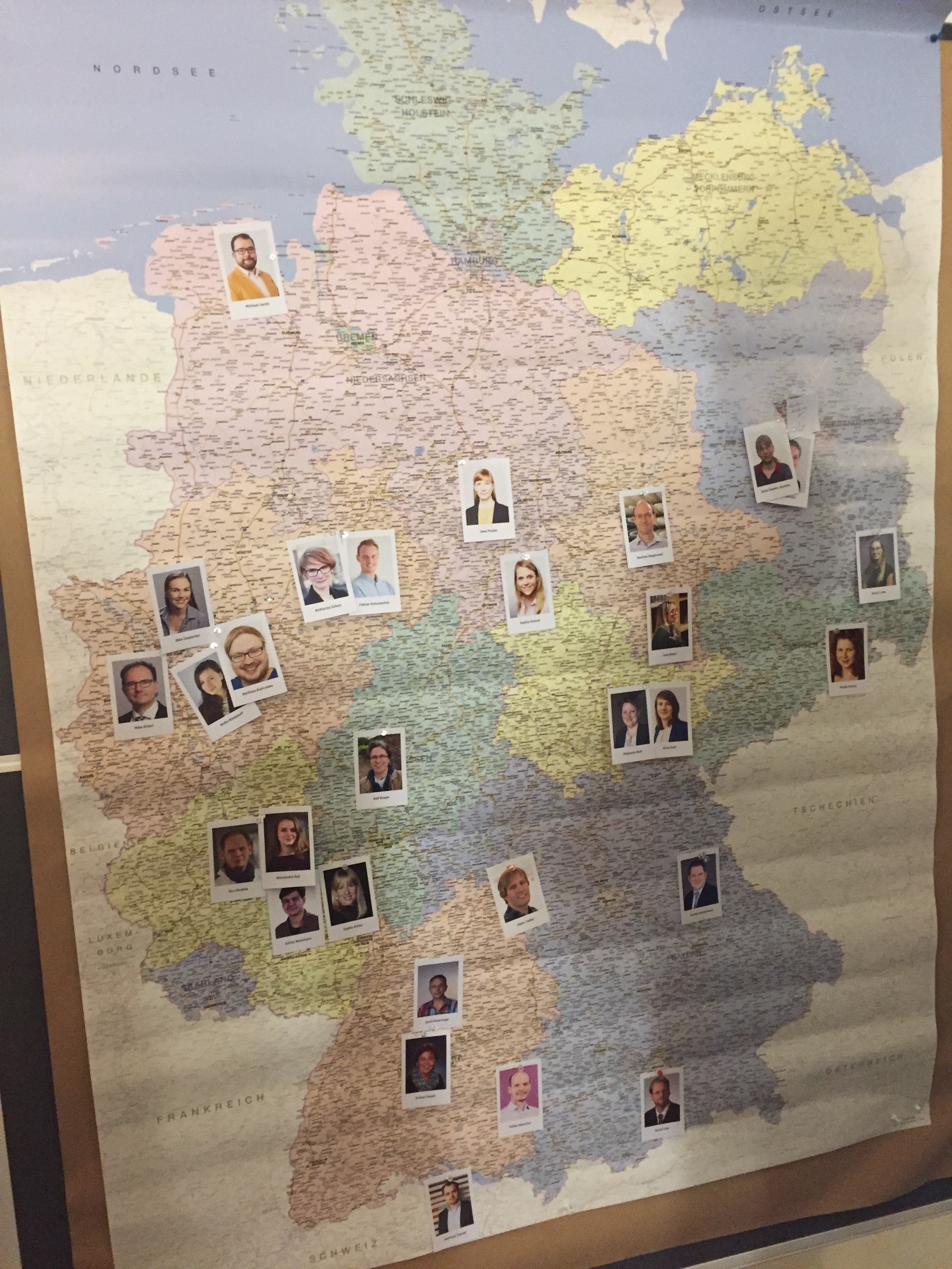 At noon the registration of the participants took place; we were equipped with name tags, a bag with program documents and pinted our portrait on a map of Germany to get an overview of the regional distribution of all participants. After a subsequent creative round of introductions, we were presented with the agenda for the next three days. The daily planning was extremely varied and creative in content and choice of methods. There were organized, scheduled units in which a total of four theme workshops took place and twelve so-called Lightning Talks (or Pecha Kucha lectures) were presented. There were freely organisable units in which groups of four people each discussed and dealt with cases brought along by the participants within the framework of the collegial consultation. In between, there was space and time on all three days for the spontaneous organisation and realisation of theme tables at lunch or BarCamp sessions on topics as diverse as Twitter in the university context, podcasting, game based learning or agile work.