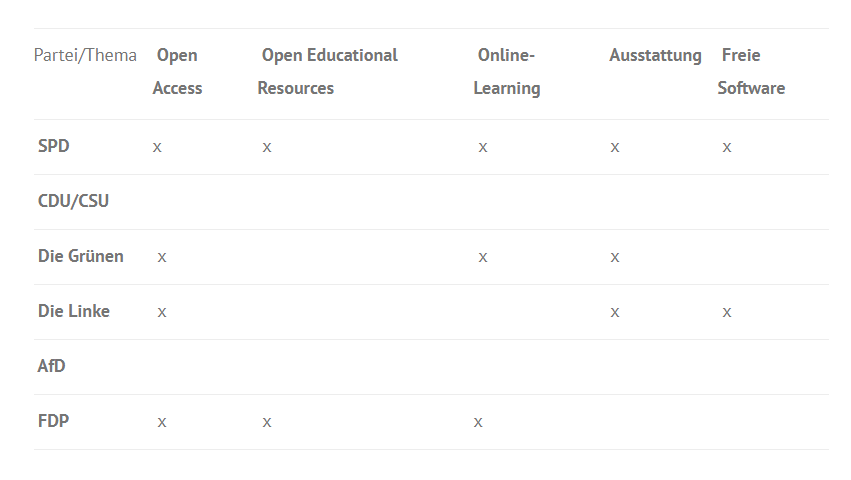 Während die AfD keine Position zu den genannten Themen einnimmt, bezieht CDU/CSU Digitalisierung eher auf Forschungsschwerpunkte wie Robotik oder Cybersicherheit. Bündnis 90/Die Grünen sehen im Zusammenhang von Wissenschaft und Digitalisierung vorrangig die Forderung einer Bildungs- und Wissenschaftsschranke und setzen sich für Open Access sowie freie Lizenzen ein. Ähnlich sieht es Die Linke, die sich für Open Access und Open Science einsetzen und den Einsatz von freier Software an Bildungseinrichtungen favorisieren.