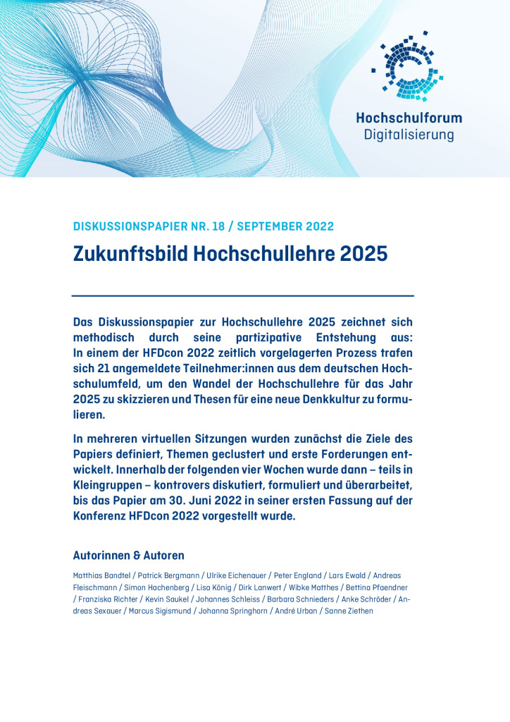 2021 veröffentlichte die Community Working Group mit “Prüfungsszenarien für die digitale Hochschulbildung” ein umfangreiches Whitepaper zu digitalen Prüfungen. Das Arbeitspapier ist nun auch auf Englisch verfügbar. Durch die Übersetzung möchte das HFD die Publikation sowohl für internationale Praktiker:innen zugänglich machen als auch einen Beitrag zum internationalen Austausch über digitale Bildung leisten.